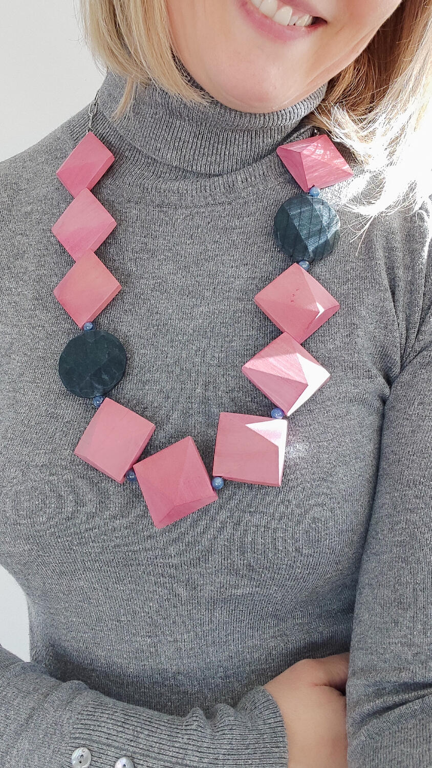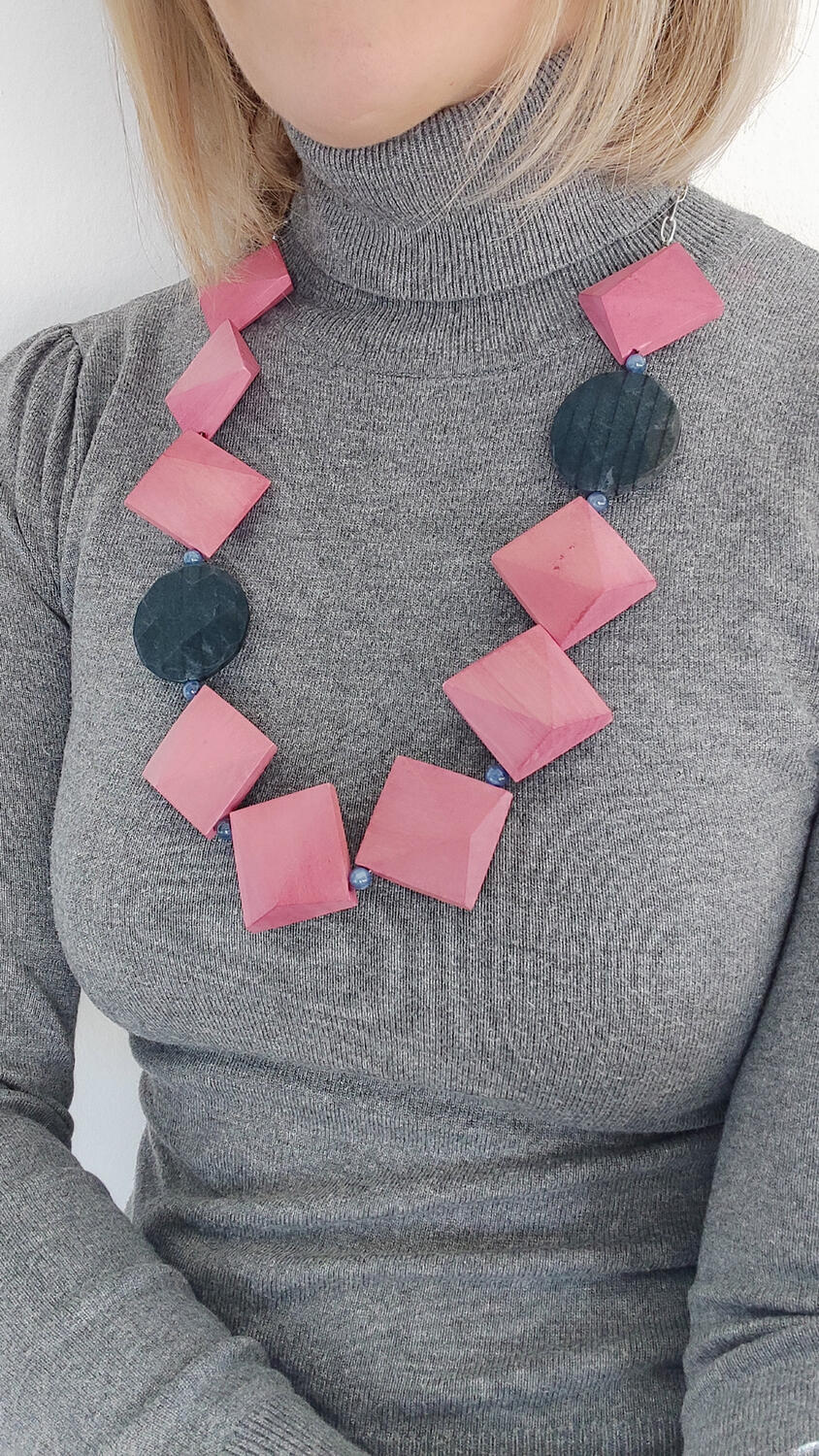 Questa collana unisce elementi geometrici in Legno color rosa e blu con piccole perle di Cianite naturale, creando un contrasto elegante e sofisticato.