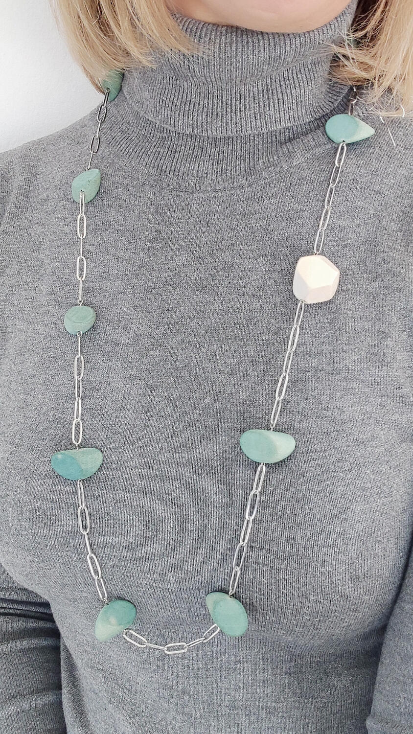 Gli elementi in Legno colorato azzurro e bianco della collana si alternano a tratti di catena in acciaio lucido, creando un gioco di contrasti equilibrato e contemporaneo.