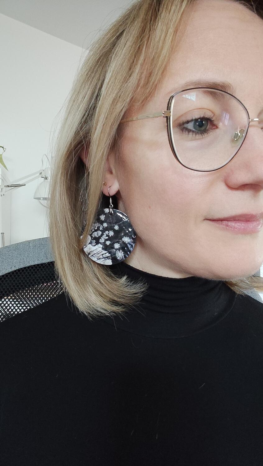 Orecchini Asimmetrici con disco di Madreperla, Vetro soffiato e Ossidiana fiocco di neve